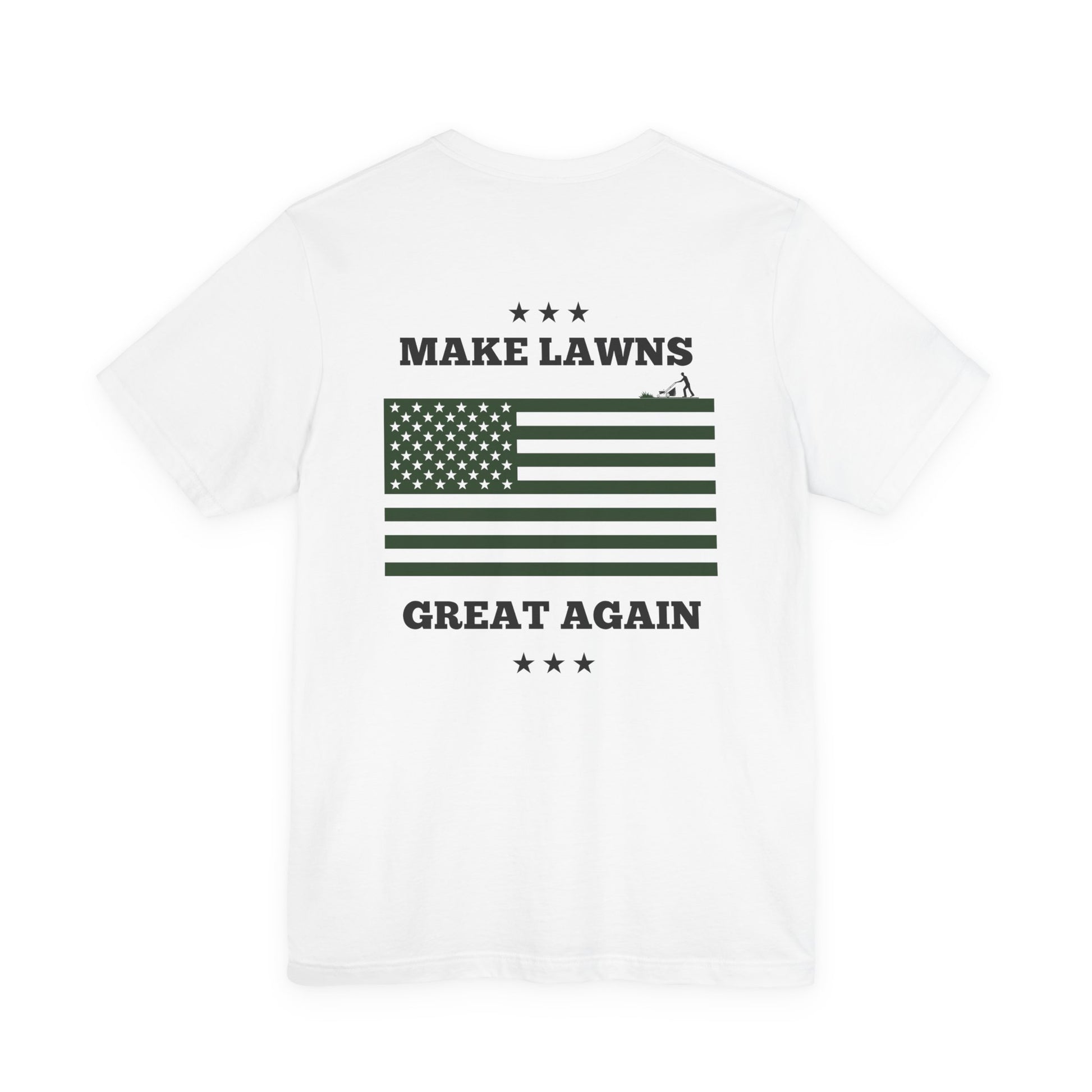 Embrace your love for nature and patriotism with our 'Make Lawns Great Again' American Flag Tee. Crafted for those who believe in preserving natural beauty, this shirt blends eco-consciousness with American pride. Whether you're tending your own lawn or garden or enjoying the great outdoors, let this tee be a statement of your commitment to sustainability and appreciation for the wild. These t-shirts have-ribbed knit collars to bolster shaping. The shoulders are tapered for a better fit over time. Dual side seams hold the garment's shape for longer.